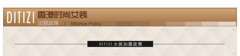 | 香港著名女裝DITIZI迪緹孜,原名D.T.Z,品牌傳承了歐式設計的精髓,是真正的高端、大氣、上檔次,DITIZI迪緹孜女裝追求的是簡約的設計,卻盡顯奢華,服裝專注每一個細節,品質高端,細節完美,提升每一位都市女性的穿衣品位。如果你追求完美的穿著和高端的品位,DITIZI迪緹孜女裝一定是你的首選,每一件產品都是精品,每一款設計都是精髓。忙碌在職場的白領女性、都市麗人,對于這樣的服裝一定是愛不釋手吧! |