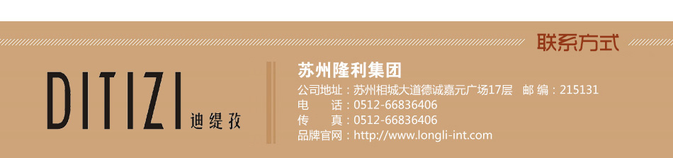 | DITIZI迪緹孜——香港著名時裝品牌,誕生于隆利國際發展有限公司,總部設于香港,主要從事設計研發女裝產品。行銷內地、香港等多個國內外地區,并迅速在各大城市獲得贊譽。公司聘請香港設計師參與設計,通過自主創新融合國外及國內女裝設計精華,將品牌時裝定位于28-45歲有內涵和品味的魅力女性。她們崇尚生活,追求品質,獨立自主,有審美情趣且知性。DITIZI迪緹孜時裝運用高級加工技藝和精致高檔的面輔料,對時裝進行完美的詮釋,強調服裝的功能與舒適性。 “DITIZI迪緹孜女裝”自創立以來一直追求高質量標準,致力于打造一個高品質的時尚女裝品牌,純正歐式裁剪,承襲經典傳奇,緊貼巴黎、倫敦、米蘭、紐約、香港最新潮流指標發布。設計師游走在每個繁華與喧囂的街頭,攫取任何一個動人的瞬間,記錄下靈感來源。這是一個激情與夢想的年代,讓時尚設計真正的走到每個人身邊,是DITIZI迪緹孜專屬設計師最大的夢想。 DITIZI迪緹孜女裝視品質為生命,從設計到生產,層層把關,注重細節,通過全球精心挑選高級面料,以進口面料,天然面料為主,精湛做工流利裁剪反映在每一個內外細節,極力締造完美非凡品質工藝,超越尊貴顧客不斷升級的品質期待。每款限量生產與銷售,讓愛美獨特的女士不撞衫,不從眾。 |