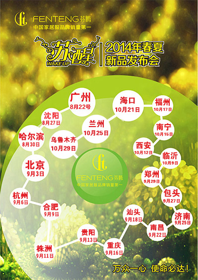 以蘇醒之名,2013年8月22日起廣州站到10月20日的烏魯木齊站,家居服銷量第一品牌芬騰帶著全新的自然奇景與您相約在這個舒適的季節里,去進行一場浪漫而優雅的旅行,讓愛隨行,萬眾一心,使命必達!遍布全國的足跡,廣州、沈陽、哈爾濱、北京、杭州、合肥、株洲、貴陽、重慶、汕頭、南昌、濟南、包頭、鄭州、臨沂、西安、南寧、福州、烏魯木齊,記住每一個獨特的日期,記住那相逢的時刻,屆時,我們來找你!